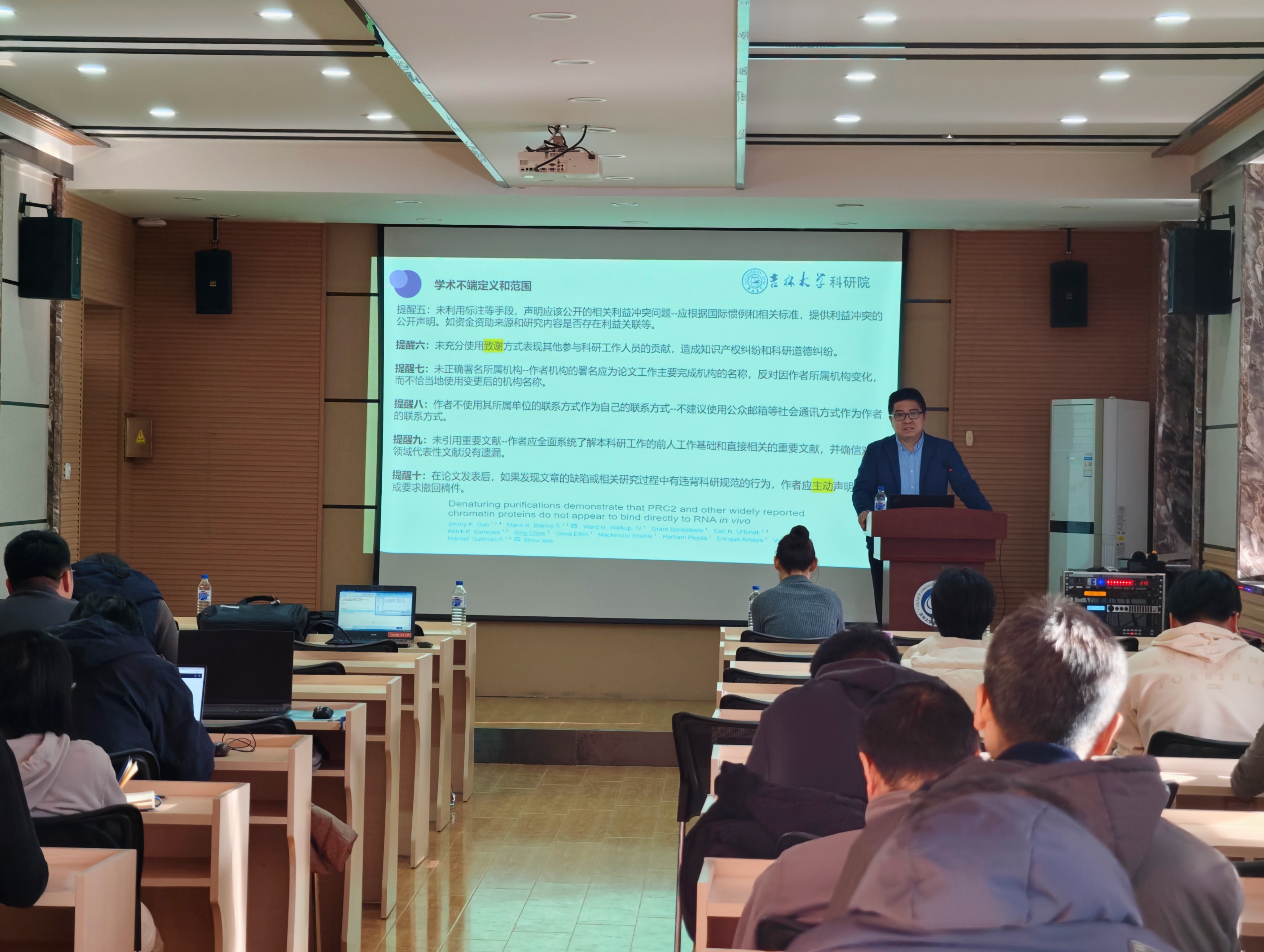 在实践指导环节,王大明主任提出五项具体要求,为师生科研行为划定准则:一是科研人员需亲力亲为,全面掌握项目申报材料核心内容,严格把关成果数据的真实性与完整性;二是强化诚信意识,清醒认识学术不端引发的职业风险与法律责任;三是坚守求真务实原则,摒弃浮躁心态,专注学术创新与技术突破;四是严格遵守项目执行规范,确保研究过程合规、成果质量过硬;五是倡导“管好身边人,做好自己事”,带动团队成员共同营造诚信科研氛围。他特别强调:“科研诚信建设绝非事后补救,而应贯穿项目申报、研究实施、成果产出全流程,提前筑牢风险防线。”