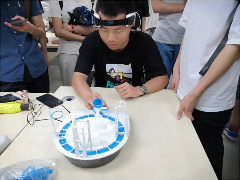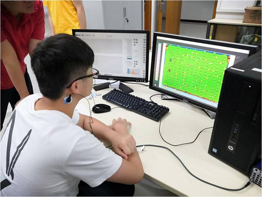 为了让团组成员对科研项目有更直观的了解科研项目,电机与计算机工程公司的万峰老师带领同学们去实验室参观了三项具体的实验,第一项是专注度训练项目,即用不同的专注度控制不同频段的风力以驱动小球越过障碍;第二项是令被实验者控制脑电波alpha波的大小在阈值之下以控制昆虫的移动;第三项是通过观察两个不同频率的频闪方格在脑中产生同频率的波,通过仪器获取这些波后用算法实现控制小车前后移动的功能。