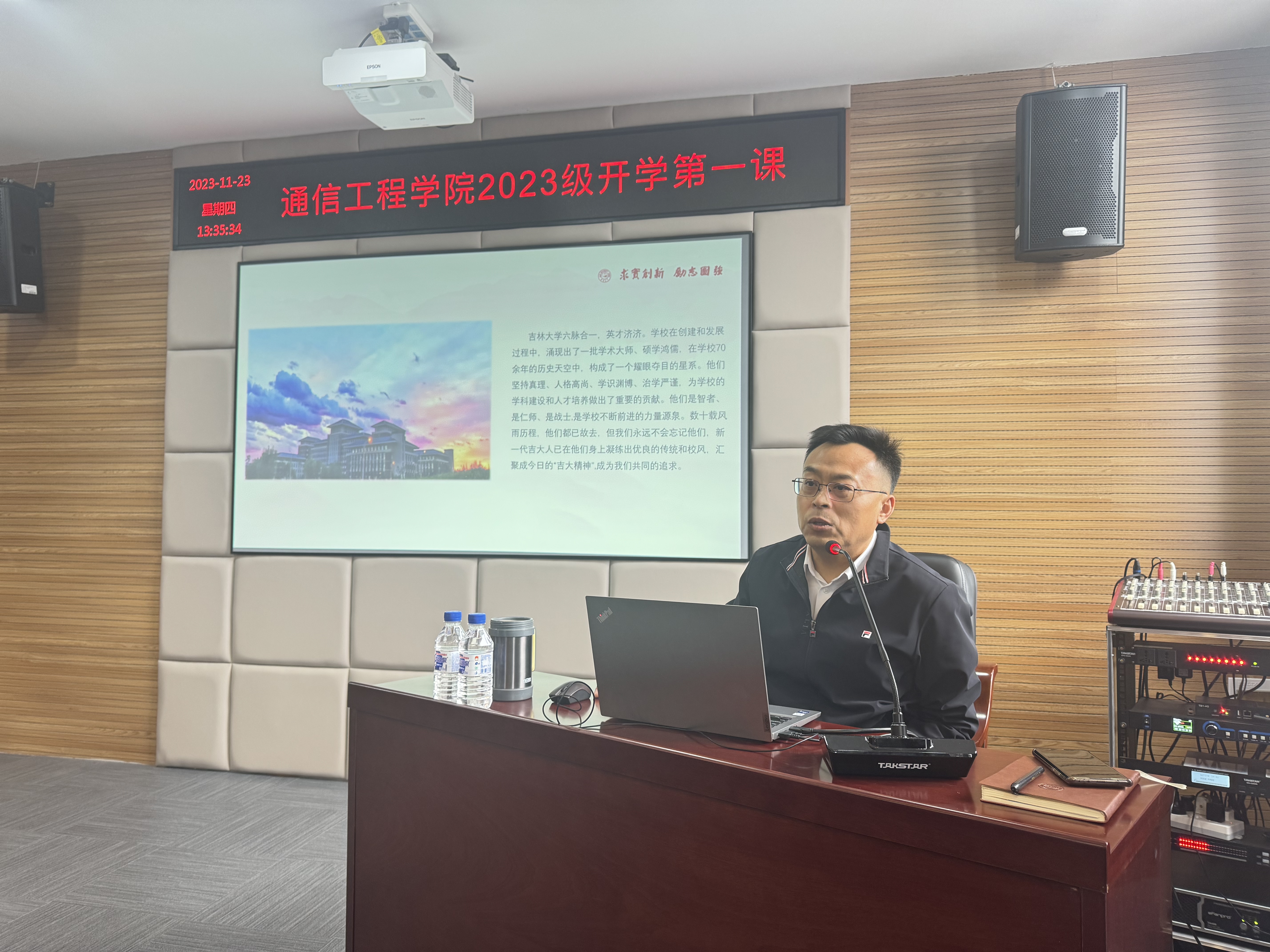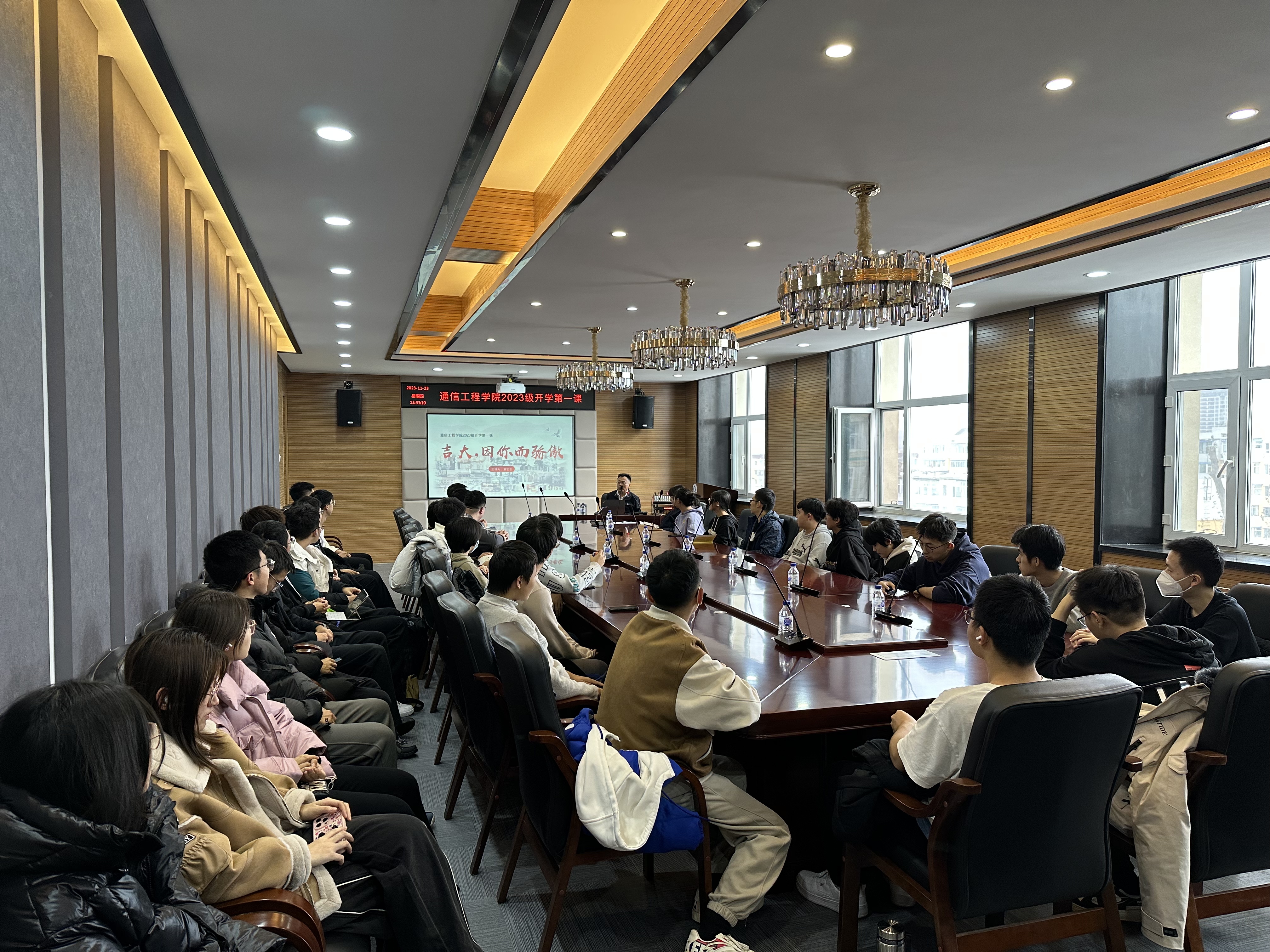 2023年11月23日,通信工程公司党委书记董宏志以《吉大,因你而骄傲》为主题,为2023级新生讲授了“开学第一课”。公司2023级部分本科生、研究生代表参加了本次活动。活动由公司党委副书记刘星彤主持。