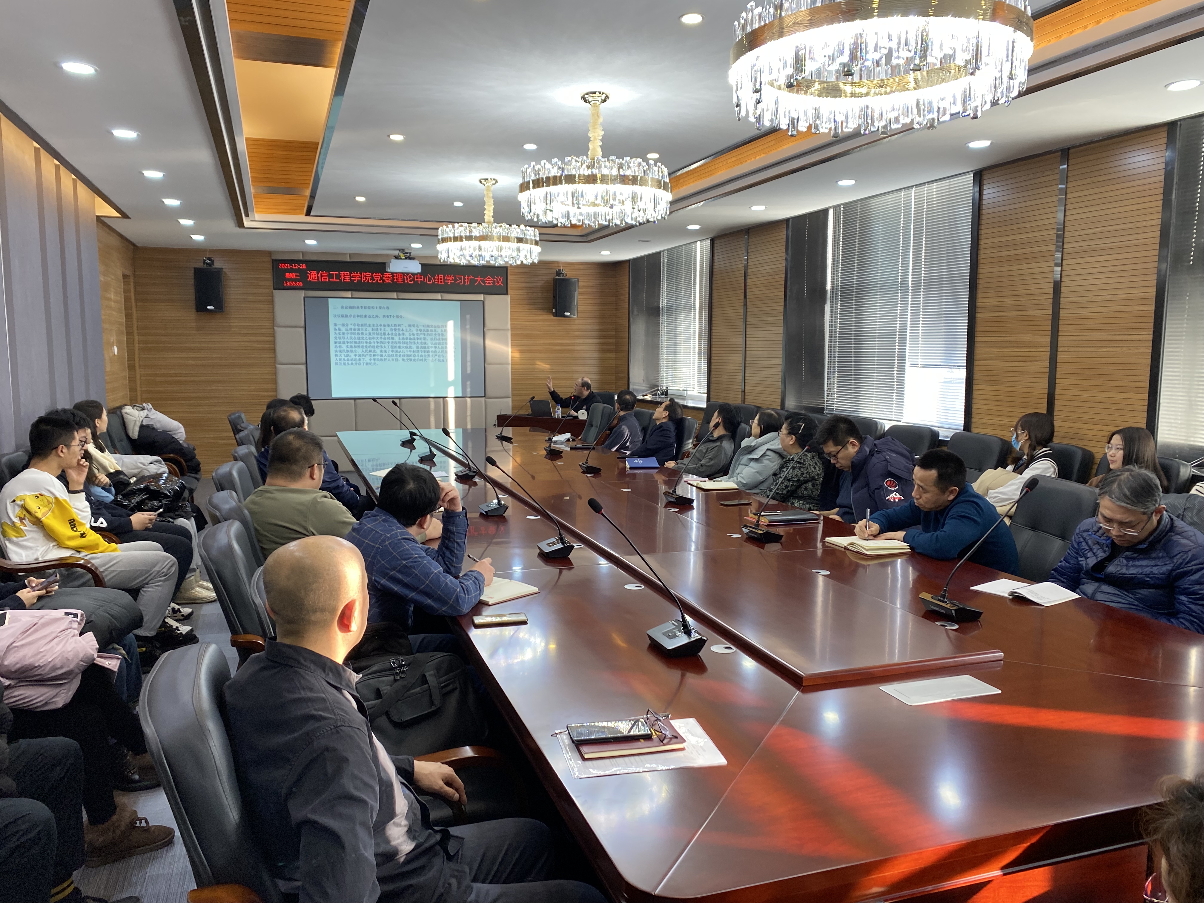 为深入学习贯彻党的十九届六中全会精神和公司第十五次党代会精神,2021年12月28日下午,tyc122cc太阳成集团召开党委理论学习中心组扩大会议学习十九届六中全会精神和第十五次党代会精神,公司班子成员、党委委员、纪委委员、系主任、党支部书记、全体行政人员和员工代表参加了会议。会议由公司党委书记郑东主持。