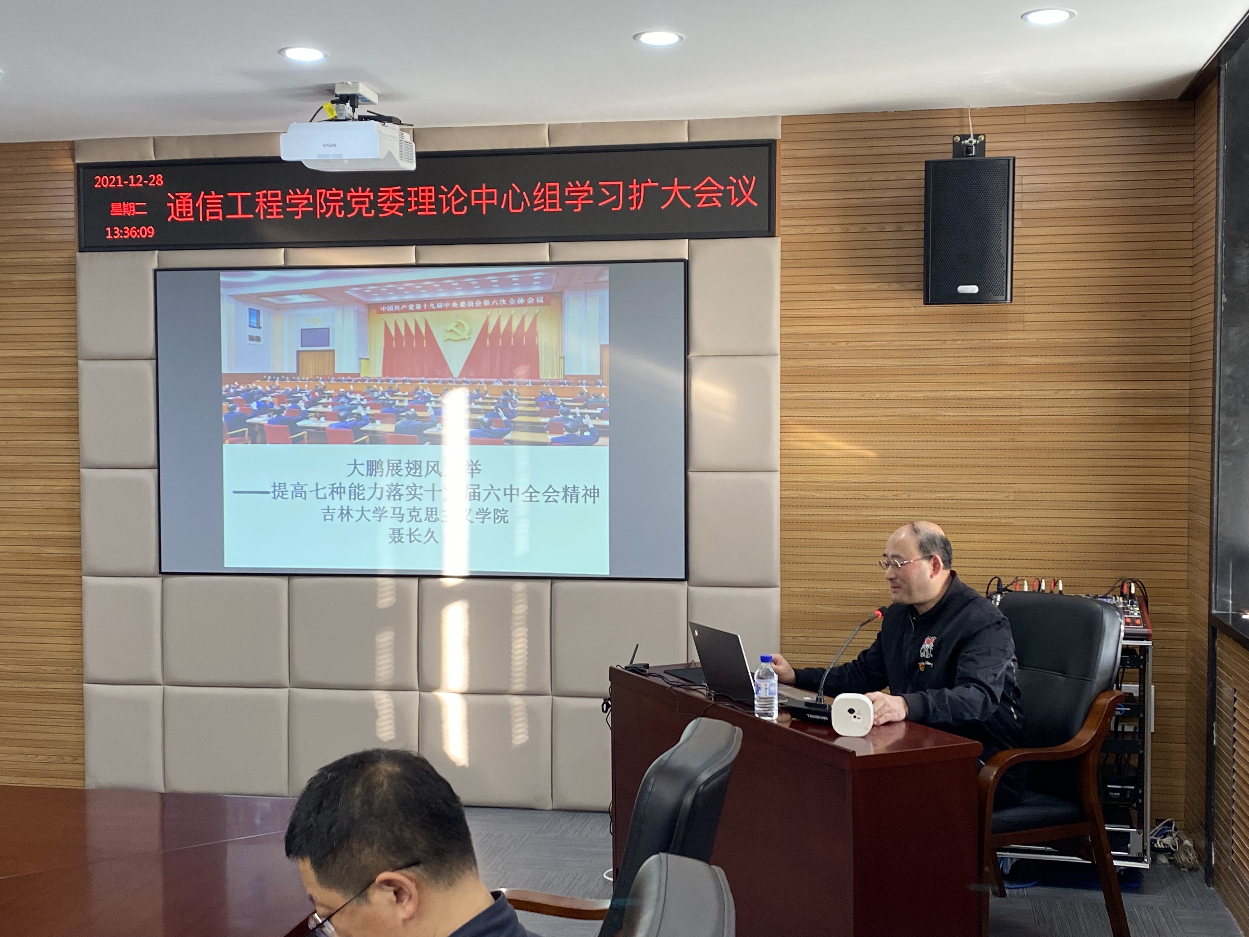 会议邀请到tyc122cc太阳成集团十九届六中全会精神宣讲团成员、马克思主义公司副教授聂长久老师,做了题为“大鹏展翅风正举—提高七种能力落实十九届六中全会精神”的专题辅导讲座。讲座以十九届六中全会精神为中心,将习总书记纪念建党百年讲话、中青年干部培训班讲话、以及干部七种能力提升融入其中。他首先结合习近平总书记在纪念建党百年上的讲话,系统分析十九届六中全会《中共中央关于党的百年奋斗重大成就和历史经验的决议》的深刻内涵和时代意义。然后他结合习近平总书记在中青年干部培训班上的讲话,讲授新时代中青年干部所必须的七种能力。最后,他结合中国共产党的历史经验,尤其是毛泽东同志高超的管理智慧,讲授中青年干部如何在实际工作中提升七种能力。聂老师的报告,深入浅出,语言生动形象,与会师生们专注倾听、收获满满。