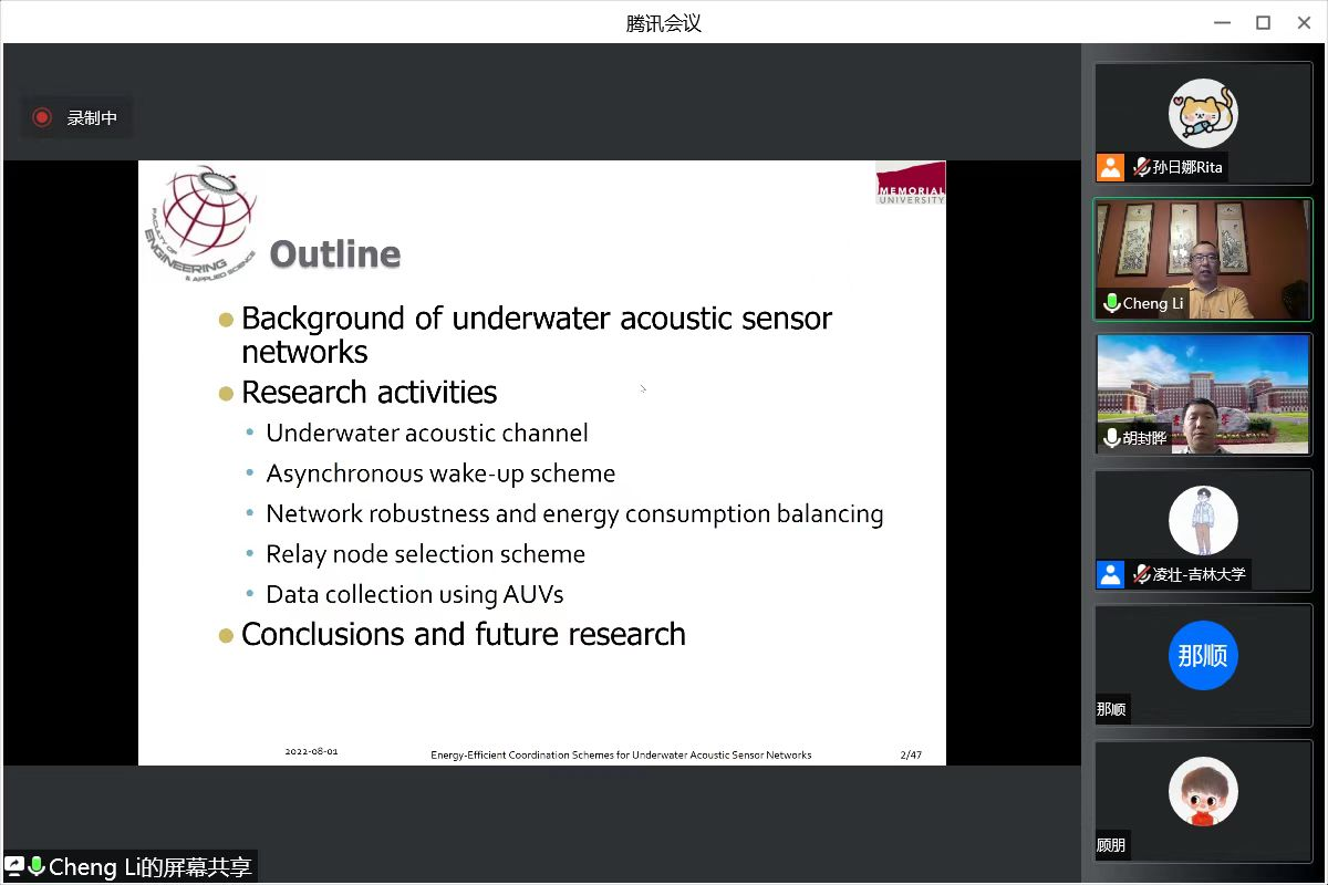 At 9:00 on August 2nd, 2022, the third lecture of the lecture series on cutting-edge technologies in information communication and control was successfully held on Tencent platform. Professor Cheng Li, Head of the Department of Electrical and Computer Engineering at Memorial University, St. John’s, Canada, was invited to conduct an online academic exchange entitled “Energy-Efficient Coordination Schemes for Underwater Acoustics Networks” with teachers and students of the College of Communications Engineering. The exchange session was chaired by Professor Hu Fengye.