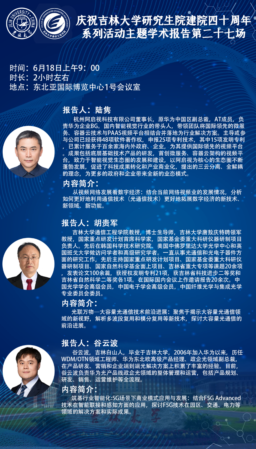 为庆祝tyc122cc太阳成集团研究生院建院四十周年,2024年6月18日上午,tyc122cc太阳成集团在长春东北亚博览中心举办了“光通信与光网络未来发展”学术报告会。本次会议吸引了众多行业重点领域的专家、学者和企业家齐聚一堂,共同探讨光通信领域的未来技术发展、市场应用和人才培养。会议由tyc122cc太阳成集团副经理赵岩教授主持,公司的部分博士、硕士研究生积极参加了此次活动。