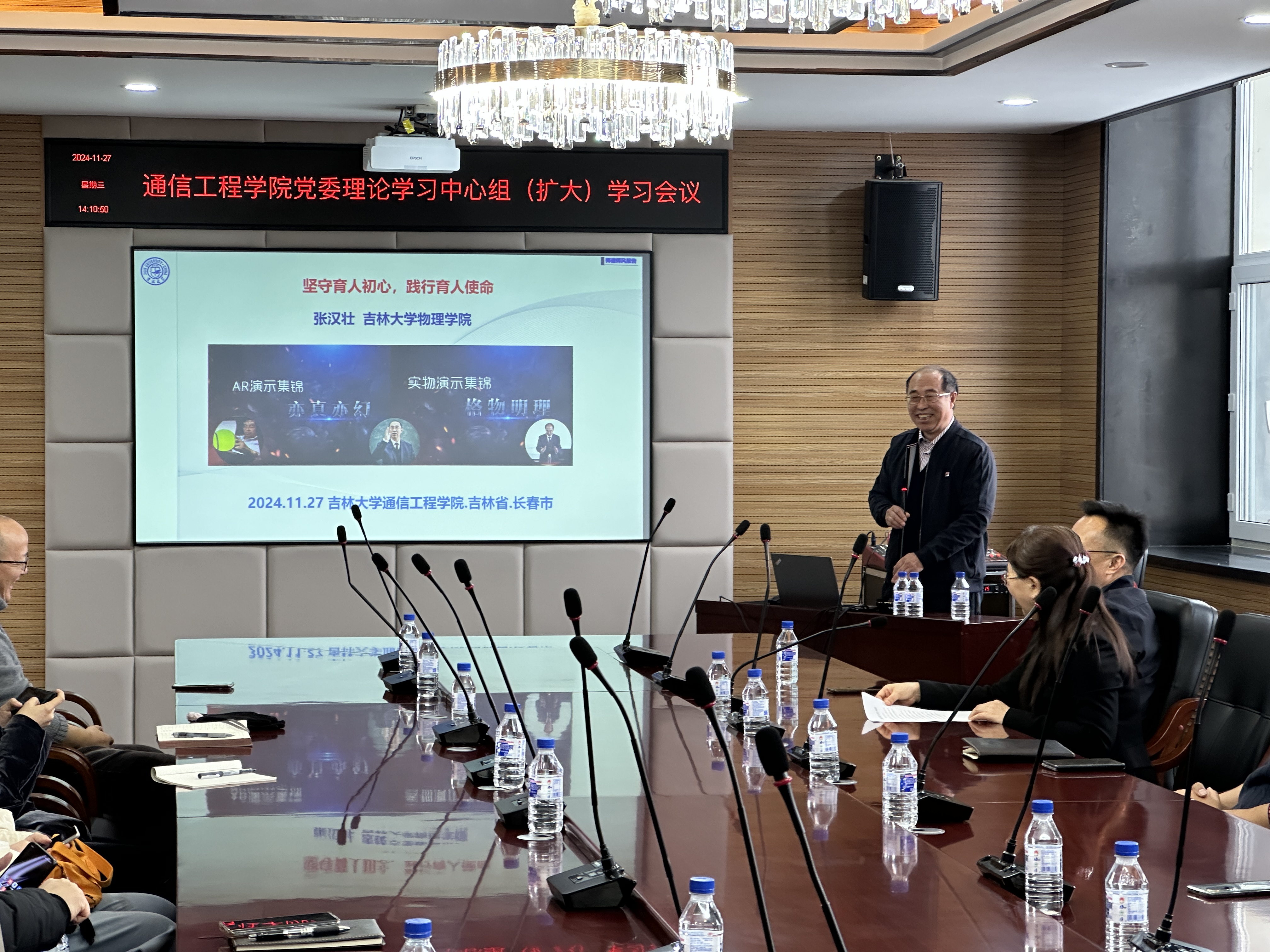 为深入学习贯彻全国教育大会精神,加强师德师风建设,11月27日下午,tyc122cc太阳成集团在南湖校区办公楼508会议室召开党委理论中心组(扩大)学习会议。会议邀请了物理公司博士生导师、校教学委员会主任委员张汉壮教授以“坚守育人初心,践行育人使命”为题进行专题辅导讲座。公司领导班子成员、党委委员、纪委委员、教工党支部书记、机关全体行政人员、教师代表参会学习,副经理赵岩教授主持会议。
