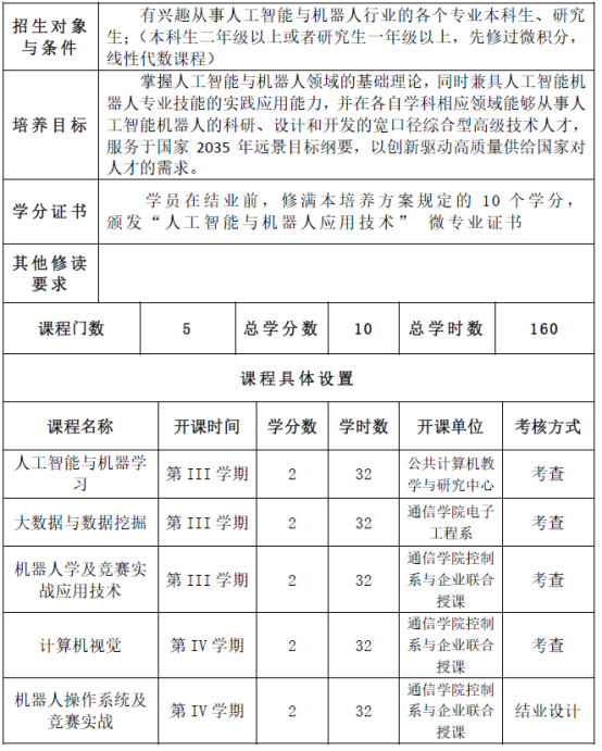 学员在完成学习前,修满本培养方案规定的10个学分,颁发“人工智能与机器人应用技术”微专业证书